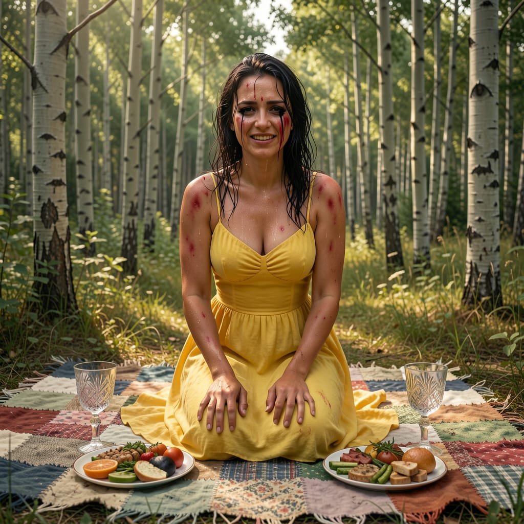 He watched her go without a word. In silence he waited beneath the aspen trees all through the night and next day. Finally, a figure dressed in yellow to match the glowing sun appeared in the distance, limping under the weight of a full pack and the aching of her blistered feet. When she finally arrived, she was squinting in the brightness of the setting sun, her dress clung to her from sweat, and her face was streaked with the melted remains of her make-up.