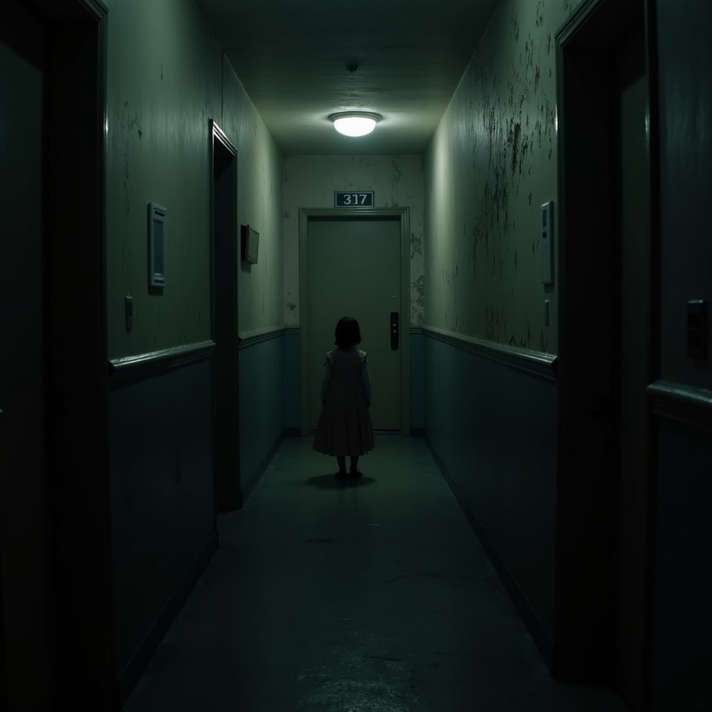 The photo shows what the hotel looked like decades ago, with corridors, stairs, and - standing at the door of Room 317, a little girl wearing an old-fashioned dress, with empty eyes and a barely perceptible smile on her lips.