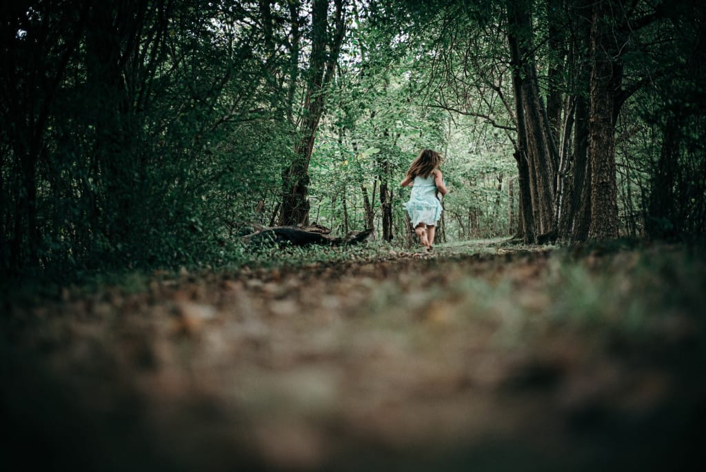 The two girls raced through the dense undergrowth of the woods. Their dirty floral dresses flowed behind them as they leapt over a large moss-covered tree trunk.