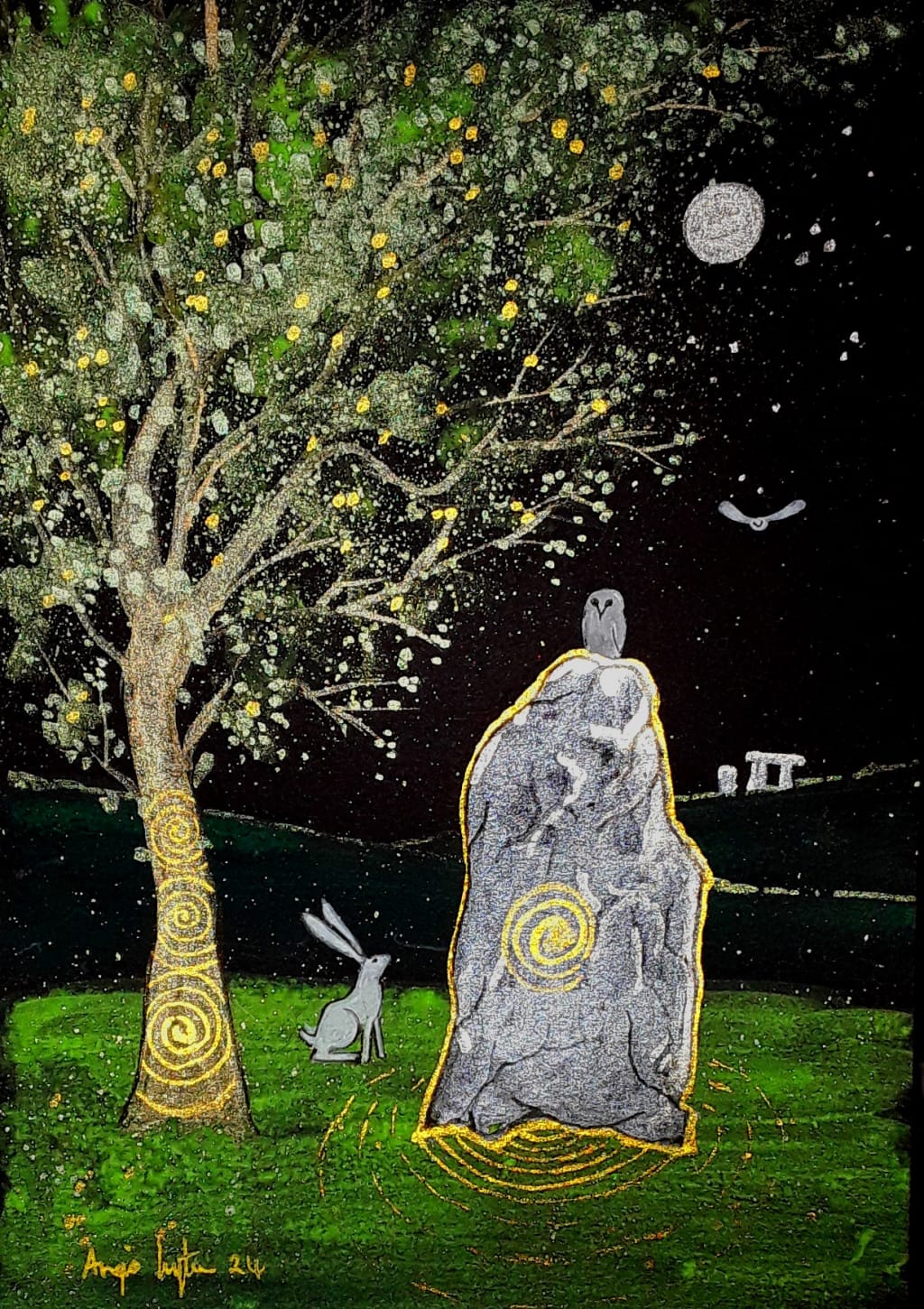 Here we stand in this sacred place of ancient stones and trees. Rabbits and other creatures sit in wonder at the standing stone as an owl flies through the night.