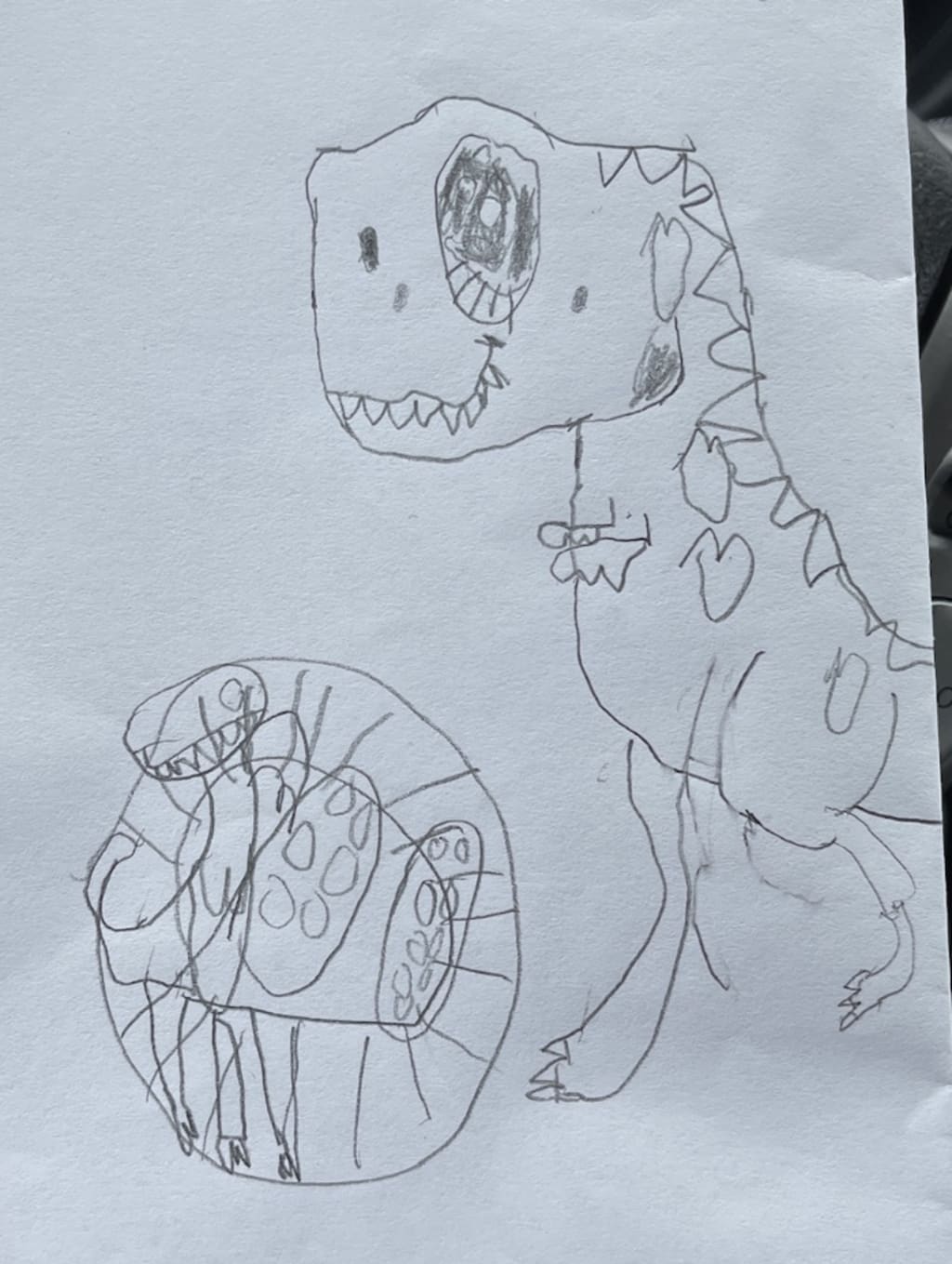 On the paper is a drawing of a T-Rex, and what looks like a baby T-Rex in a little nest. It says “I hope you love this.” And I do, I really do. “I love it baby, thank you!” I say, getting choked up.