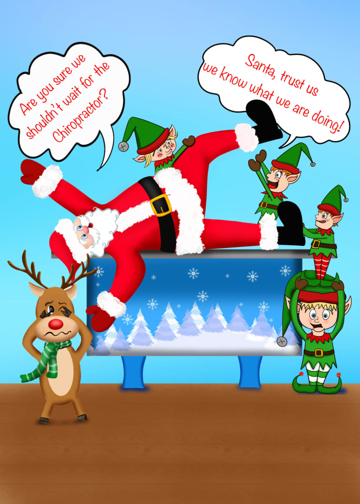 Rudolph was so relieved that he hadn’t made the biggest mistletoe mistake by allowing the Elves to work their holiday chiropractor magic on Santa.
