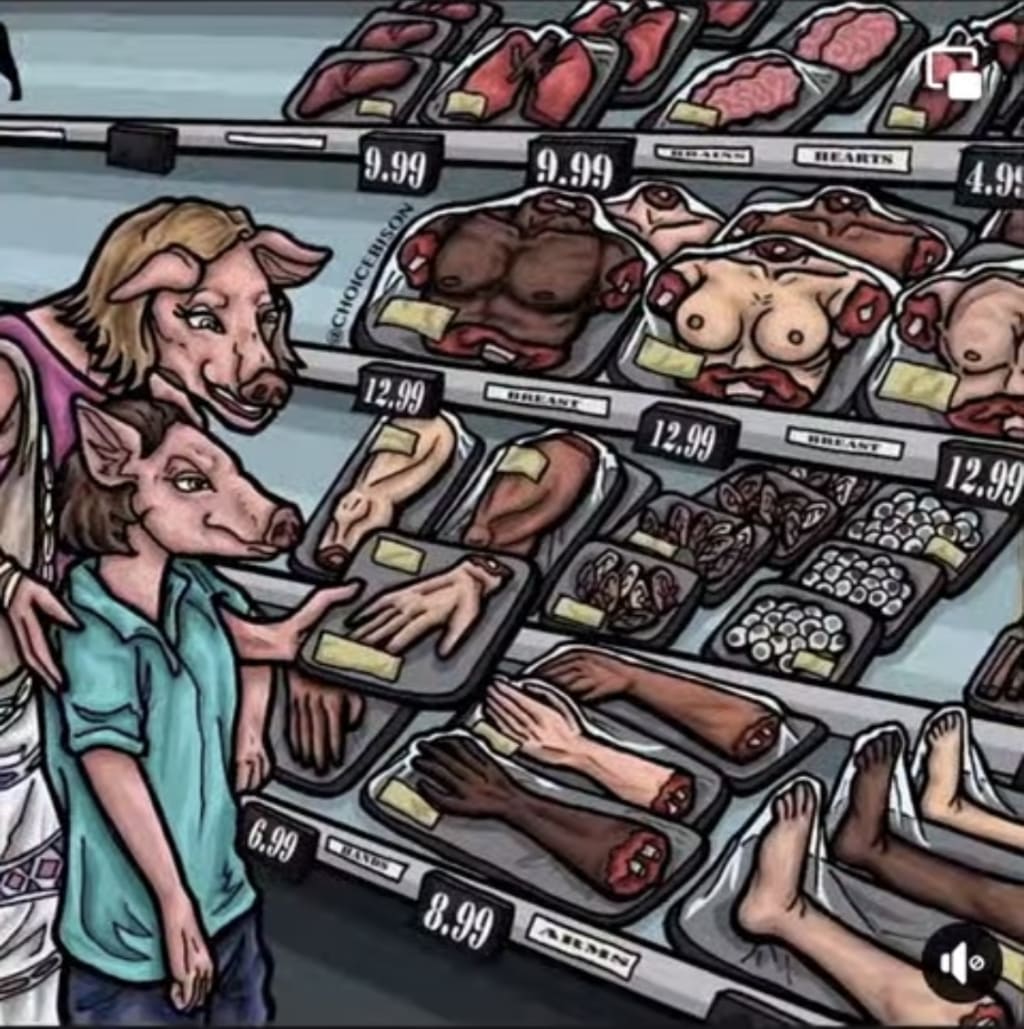 “Don’t be ridiculous. You need to eat animals for protein. Remember that advert for the animal industry and all of those studies they quoted? If we don’t eat them, we won’t survive. It’s the natural order of things”