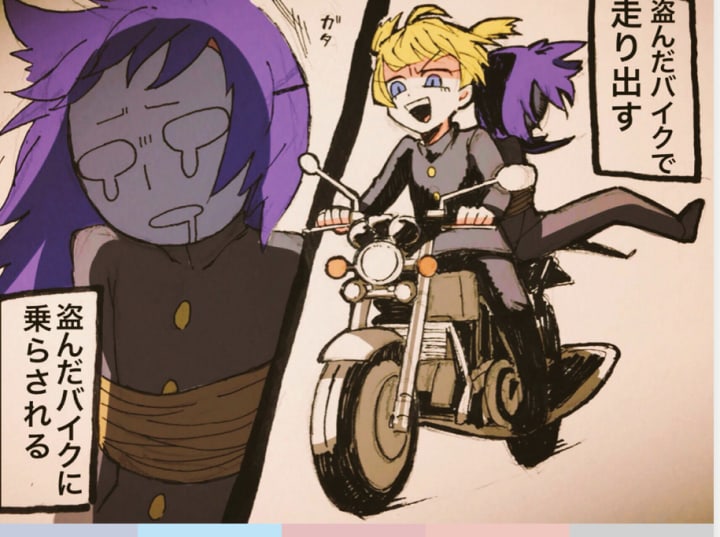 Kedamono comes out of the public bathroom, dizzy and depressed, having thrown up from an all day nervous deposition, he goes to the front of the local diner and gets a table to sit down to get a drink of soda. His face is red from crying and the waitress notices.
