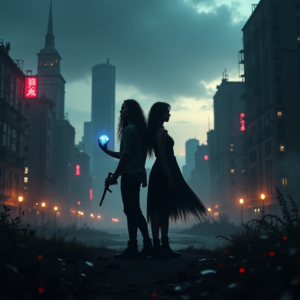 Rhia pressed against a graffiti-stained wall as her breath echoed down the deserted alley. The last rays of a dying sun painted the crumbling skyscrapers in bruised purple shadows. Neon signs sputtered overhead, flickering across rust and overgrown vines. In her trembling hand, she clutched a glowing data crystal. For a moment she felt alone, yet holding the crystal felt like a spark of resistance against the night. With every heartbeat, the city felt alive with danger.