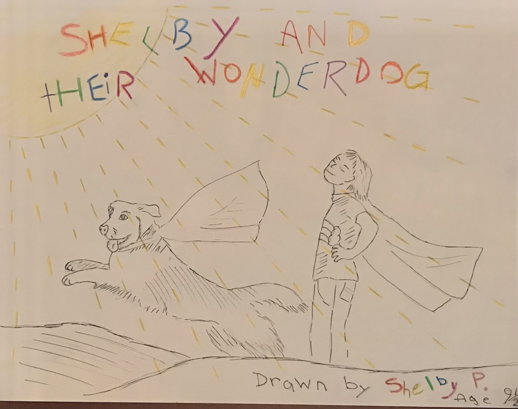 "Shelby and their Wonderdog," said Shelby, but they still sounded sad. Then they pumped their fist over their head and shouted, "Wonderdog!"