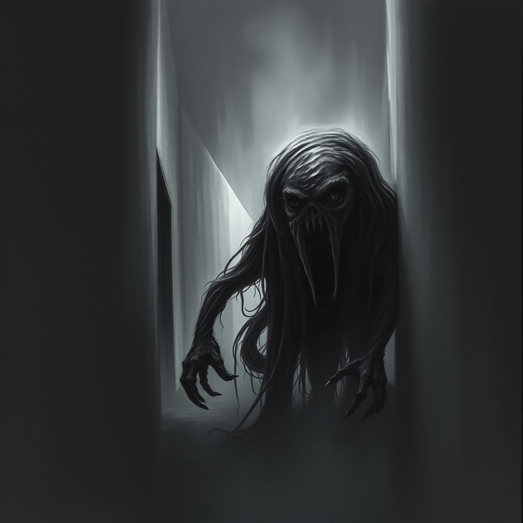 I opened the door and then noticed this was the only one in the corridor, and it was at the end. There are no lights in the corridor, and it seems to merge into a foggy blackness after about twenty feet.
