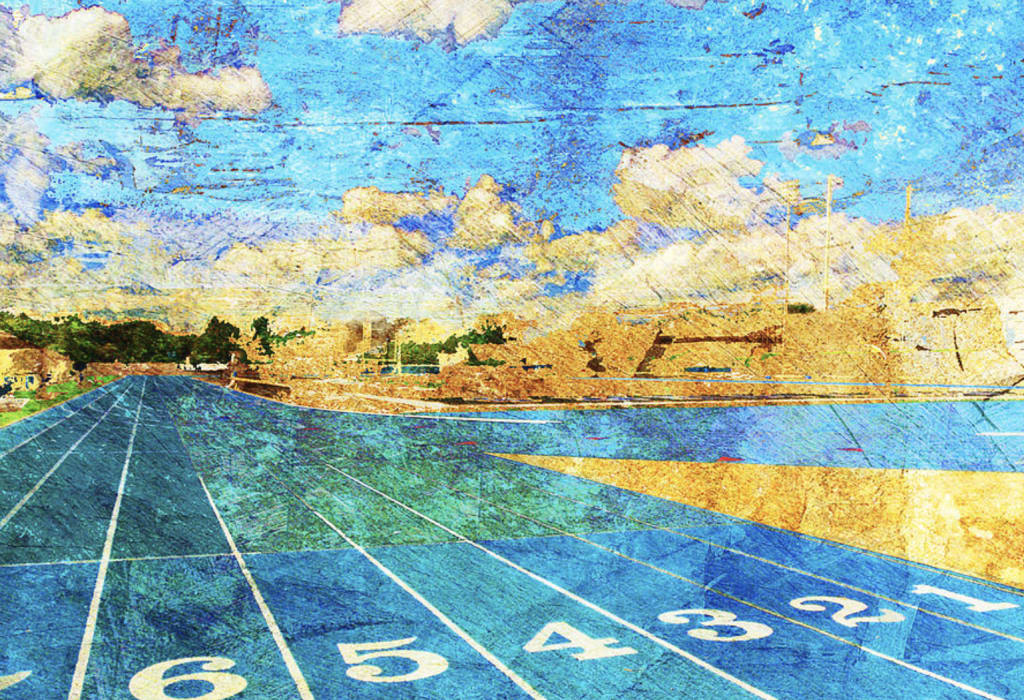 From the top of the bleachers, you see there’s a fellow trotting around the track. The sun is newly-risen, and sits low in the sky. The jogger passes underneath it, coming around the bend in your direction. He’s got on a royal blue track suit — jacket and pants — and white running shoes. His hair hangs just above his shoulders; it’s scrunchy, and it bounces as he jogs. On the far side of the track, there’s a brick building with words in white capital letters that say: Comanche Stadium. Beyond the structure, you see a field of Texas Bluebonnets in the cool blue hue.