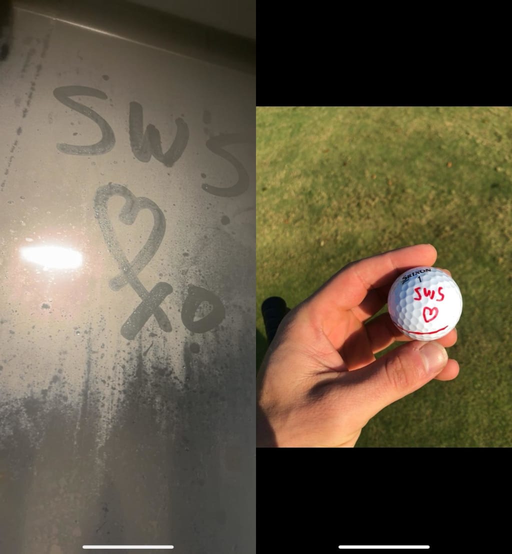 I write her intials everywhere. Carved in trees. Sharpied on the golf balls I use. I love the symmetry, the simplicity because she is anything but simple. My written devotion to her always begins in the shower. I'll slide the glass door open, turn the shower knob slightly hotter than what is immediately comfortable. Then I'll step out and wait until the glass fogs like beer mugs in a fridge. When the glass morphs from transparent to translucent, that's when I'll step back in. I'll stand still, elated by the hot water, embodying the warmth that feels like she did, and then I'll begin the artwork. I'll search for a spot I hadn't used before, and then I'll write her intials, "SWS" and underneath, a heart and an X and O. Then, I'll write it again on the other side, then again on the shaving mirror. I'm approaching two years in a row without missing a day. I'll even do this at friends' houses. In essence, I'm the Banksy of love.