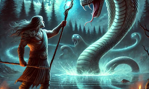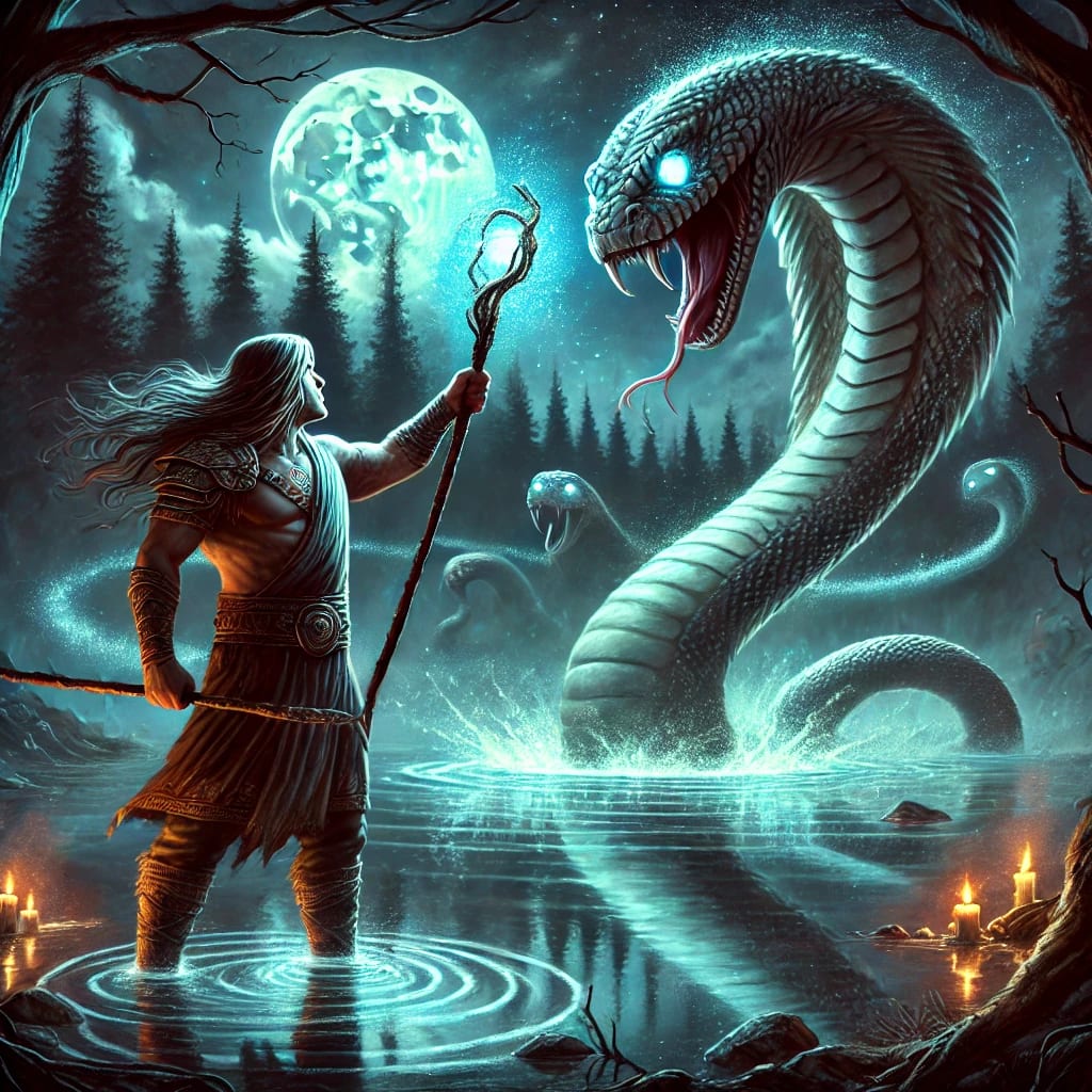 Determined to set things right, he ran to the lake. Once again, he struck the water with his stick, harder and harder, until Jalraj rose from the depths, angered by the disturbance.