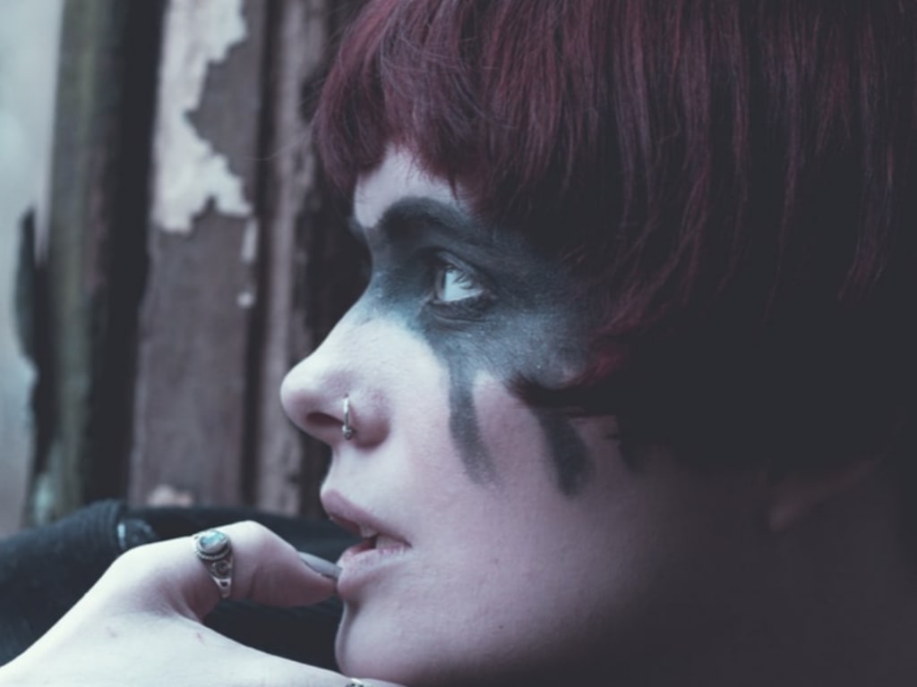 Once thrust into the unfamiliar arena he waited motionless, allowing her heavily shadowed eyes the time they needed to take him in, even as his own took her in. They locked-in, her eyes did, gazing with the alertness a bored house-cat gives to a new rubber mouse, or to any other diversion, no matter how slight. At the same time, his were noticing that her lips were the same dark, grotesque shade of purple as her eyes, and her hair too, but for the bright pink streak fanning out through her bangs.
