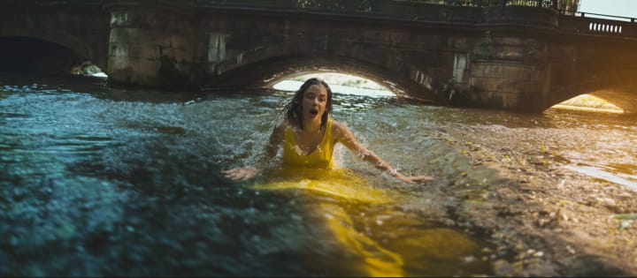 Moments later, she resurfaces, coughing and flailing. Her dress floats around her like a giant yellow lilypad. Several men in motor launches are already heading in her direction.