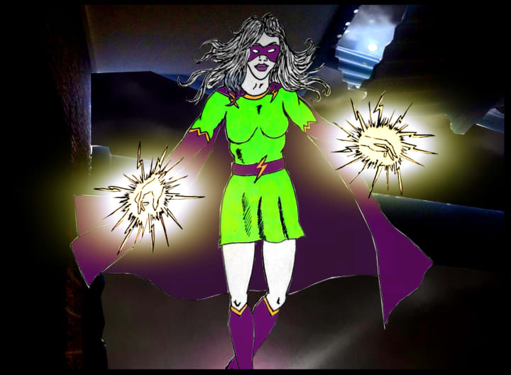 Suddenly a loud crackle of lightning had Reisha diving aside as a boom sounded and dust particles filled the room. The personal assistant sat up and coughed, while waving away the dust and noticing that the large concrete block was now several smaller pieces. She turned in the direction the lightning bolt had come from and spotted a glowing woman who appeared to be in a green and purple costume; although the dimness of the room made it hard to see exactly which shade of the colours they were.