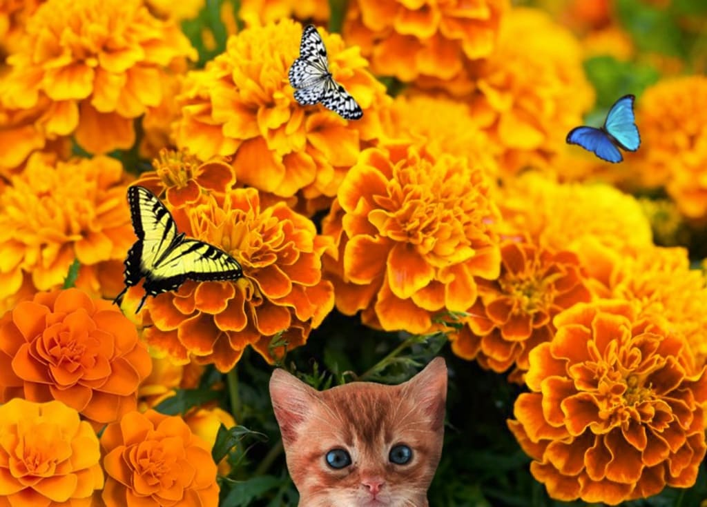 A rustling in the nearby flowers roused her from her drifting. Curious, she tilted her head, trying to discern what was causing the disturbance. She noticed swishing amongst the marigolds. Serena hoped it was a rabbit—she’d love to make a cute, little bunny-buddy. Creeping ever so quietly towards the rustling marigolds, she hoped not to startle whatever was concealed inside. Holding her breath, not daring to risk scaring the critter away, she approached inch by inch until the marigolds were right in front of her. Peeking through the blooms, a tiny, furry face gazed up at her. Blinking, it cried a squeaky “mew.” Serena’s heart melted into a pile of delighted goo.