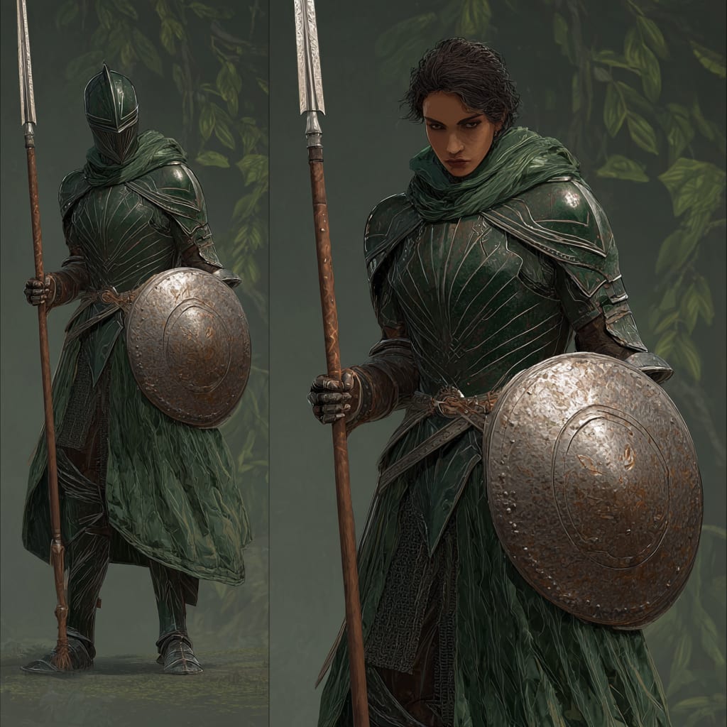 Description: A long, balanced spear infused with Mycorrhizal network threads. Its shaft is reinforced with living mycelium threads, pulsing faintly with green light, while the elongated sliver green leaf shaped spearhead gleams with hardened crystal surrounded by a mist of spores. Designed for both precision piercing thrusts and sweeping slashing cuts, it channels both physical force and spore borne abilities with equal ease. Built to be able to wield in one or both hands for battlefield adaptability
