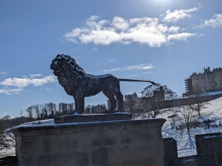 Today I wandered down to the bridge over the River Aln through the snow in hope of catching the Alnick Lion alone and having a conversation with him about where he was from, what he was doing and why his tail was straight when it should be floppy like all the other lions.