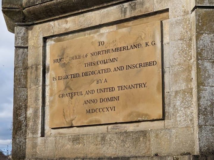 The big column I sit on is known as "The Tenantry Column" It was erected in 1816 by the tenants of Hugh Percy, 2nd Duke of Northumberland in thanks for his reduction of their rents during the post-Napoleonic depression, however, there are rumours that Hugh Percy raised rents because they could obviously afford to pay for things like column and became known as "The Farmer's Folly". This is the plaque at the bottom of the column.