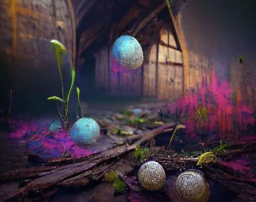 They hung upside down from the ceiling beams of the windy barn, like liquid stalactites lined up in endless, perfect rows upon the base of nearly every beam in the ceiling . Each and every one matching and resembling gossamer tears suspended by the most of slender of, almost ethereal threads. Occasionally the daylight pierces the cracks in the outer wall of the barn, highlighting a lazy smoke that drifts aimlessly from a nearby chimney. It creeps through the walls of the barn and is reflected through and around the orbs in a thousand crazy directions as diffused colours melt amongst themselves on the surrounding walls. The locals know these delicate orbs as tears of the dragons, each one of these silvery suspended drops are fairie chrysalis’ that are native to this area. Spoken of by both young and old, it is said, more whispered around these parts and some others; that a hatching of would bestow upon the host great luck and fortune, a hatching of this size could very well make a new king. The thunder of an approaching storm speaks to the hatchling fairies, they slowly begin to roll and gyrate in their membranous shells emitting a low resonate hum and the occasional bursts of pure white light. The storm intensifies and the occasional burst of lightning whips them into a fervent fevered frenzy. The fairie cocoons begin to dissolve into the very air around them as the sheer beauty of the occupant inside becomes more and more noticeable. Thin wings, as soft as a summer breath slowly unfold with an almost liquid grace, and then the most tiny, almost perfect female human face appears coyly and is slowly revealed beneath the opening wings. Smiling, she stretches her wings in a ballet of slow delicacy then with an effortless flutter, launches into the air. Her maiden flight becomes a netted swansong. Just outside the barn, near the door but not in the way, a weathered hand written sign sits next to a recently used chopping block. Fresh blood and other loathsome appearing substances threaten to spill down it on one side -