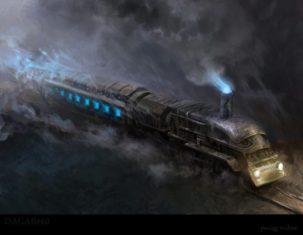 Woken with a heart-stopping jolt, I smack my head sideways on something solid...my peripheral says its a window pane...dazed, confused, bleary-eyed and panting in short sharp breaths...pushing myself up in the seat I'm in...fetid air rushing into my burning lungs...am I dreaming?...is this a dream?...why are my hands so cold?...why do I have a cold sweat on my brow?...what the fuck was that?...was it a dream?...hang on a minute, am I on a train?...how the hell did I get on a goddamn train?... I rub my eyes with the heels of my hands, blurring my sight momentarily. I turn my sleep-stiffened neck and I can make out my groggy reflection in the window... the clouded moonlit darkness outside encroaching with each flickering of the carriage lights...
