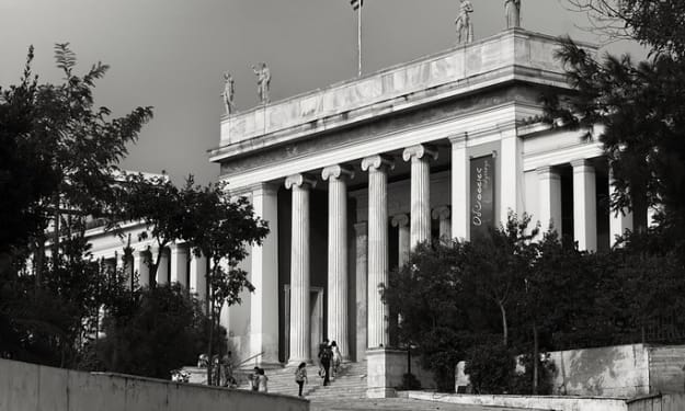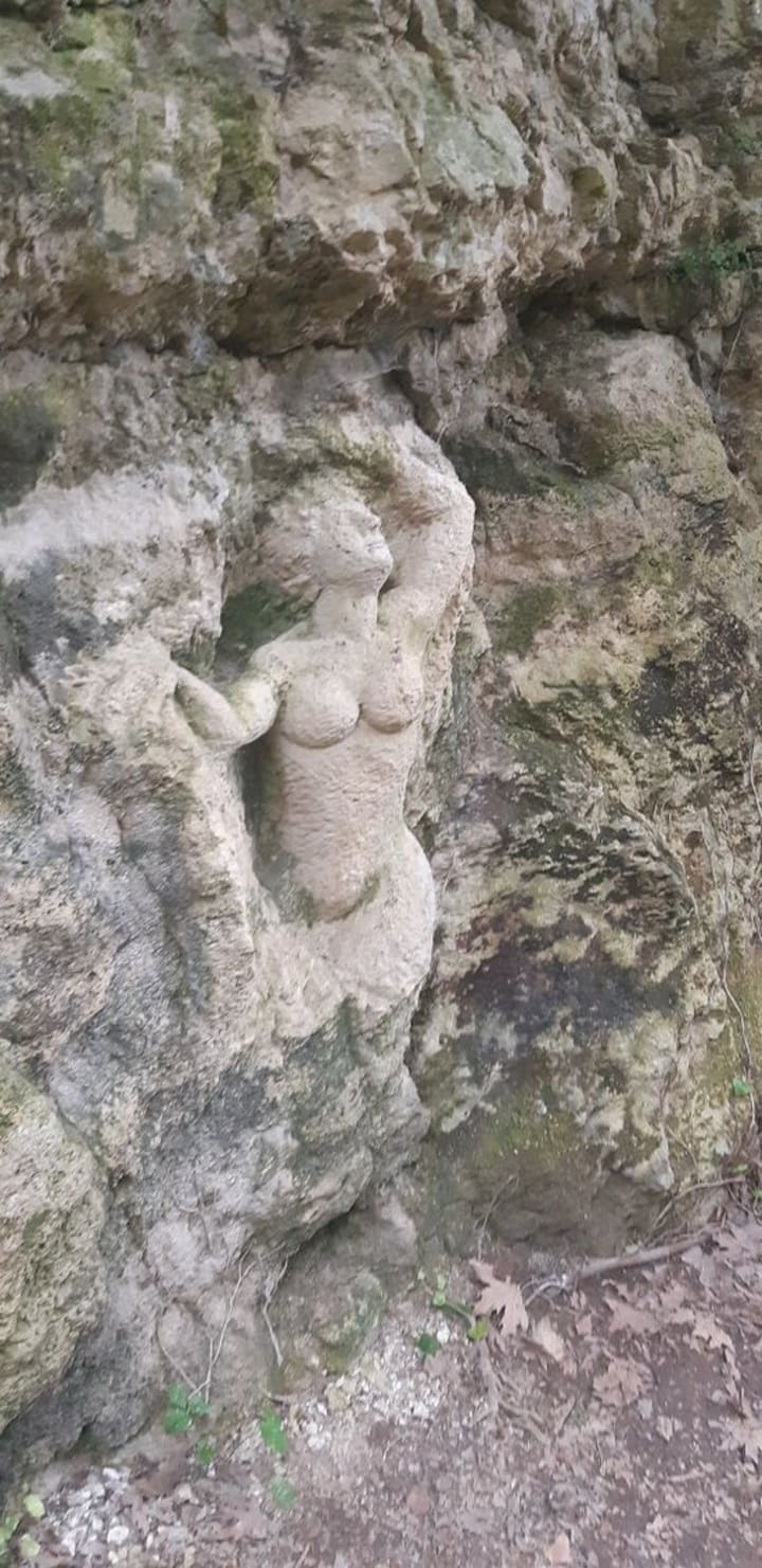 Aurora follows Logan into the grassy foot hills of Mount Ida. A cool wind blows down from the mountain, the wind moves the branches around them as they walk along the shallow waters of a river bed. A Great White Heron fishes while the singing of Goldfinches fills the air. They come to a stop at a fork. At the fork is an eroded statue of a female goddess who holds a snake in either hand.
