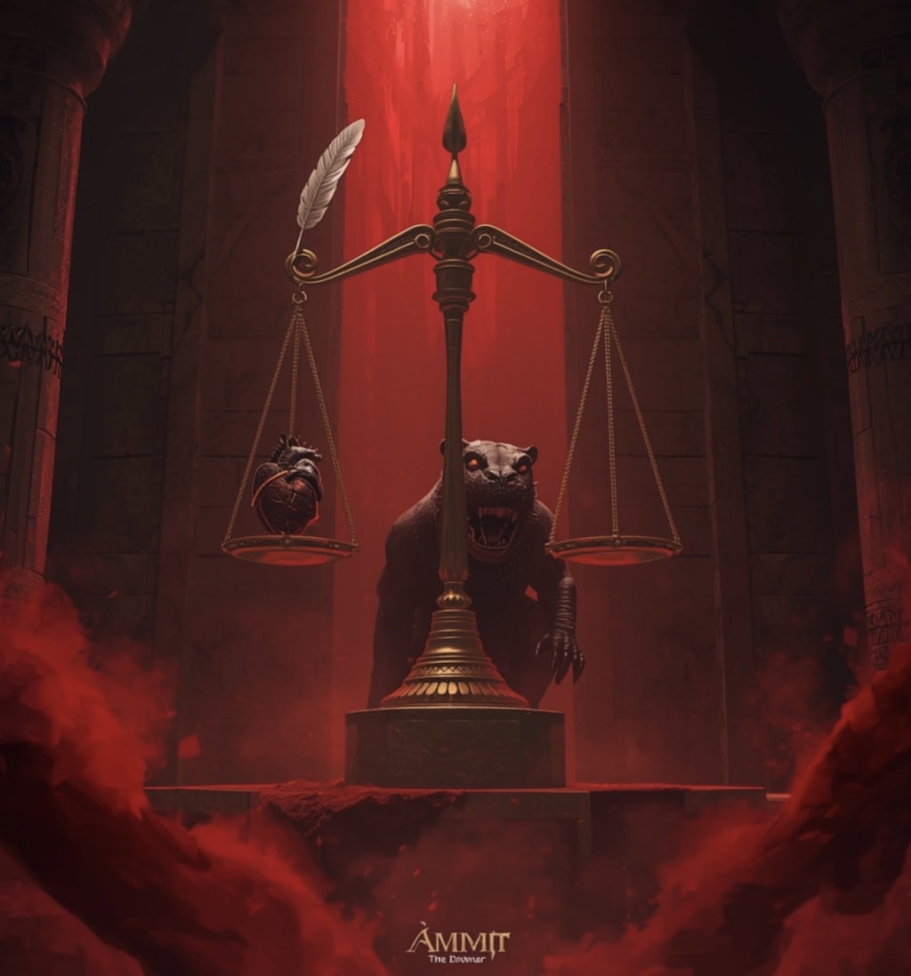 Ammit is a mysterious figure in Egyptian mythology. A stoic and soulless entity, she’s believed to be a fusion of three deadly predators of the Nile, her appearance alone provides its soulless victims with trembling horror. One by one, as she snaps ferociously her jaws and plants herself down firmly with the eeriest sound, she swallows her prey. As the soulless prepare unwillingly for their terrible journey to Hell an overwhelming feeling of emptiness consumes them, all that remains is a corrupted black heart riddled in anxiousness fear and regret.