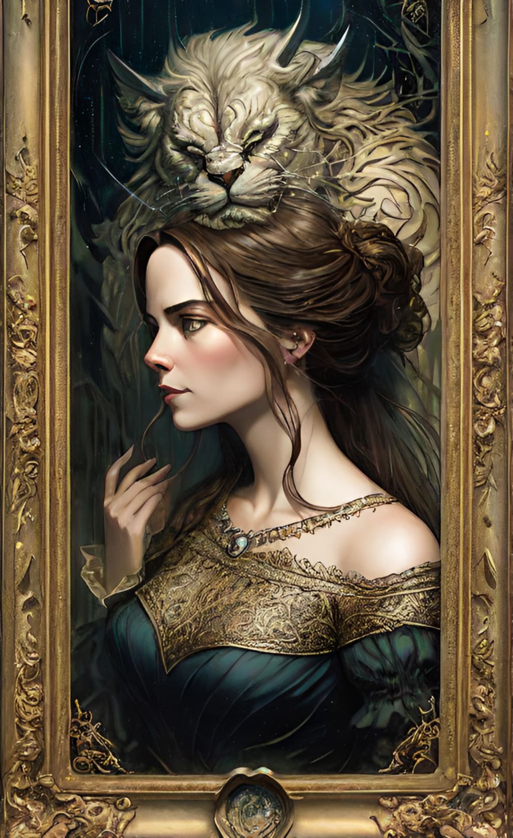 Standing in front of the portrait, realizing how much she missed a man she never knew or met truly. Her heart was pounding, and the air was heavy with anticipation as she prepared to recite the ancient incantation that held the key to breaking the curse. Thinking within herself, "What would he think of the monstrous side of me?"