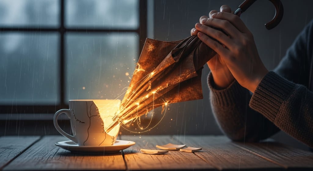 She held it over the bowl, the rain drumming a pathetic tattoo on the torn fabric. But then, a soft, golden light emanated from the umbrella’s tears. It fell on the mixing bowl like liquid sunlight. The hairline crack sealed itself, the glaze becoming perfect and smooth once more.