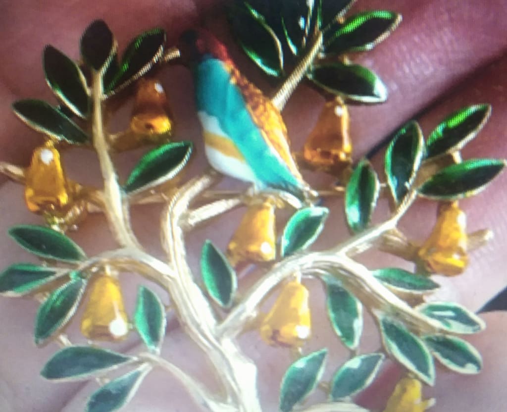 After the party, Carol presented Caroline with a small box wrapped in recycled yellow and green paper. Caroline's eyes widened! Tears welled up in her eyes. Gratefully, Caroline appreciated the story behind the brooch. She heard the story numerous times over the years. Chocking up, Carol retold the story about the Partridge in a Pear Tree brooch being given to her by her late spouse on their first Christmas as husband and wife.
