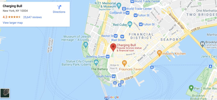 It's a bronze sculpture on Broadway just north of Bowling Green in the Financial District of Manhattan in New York City.
