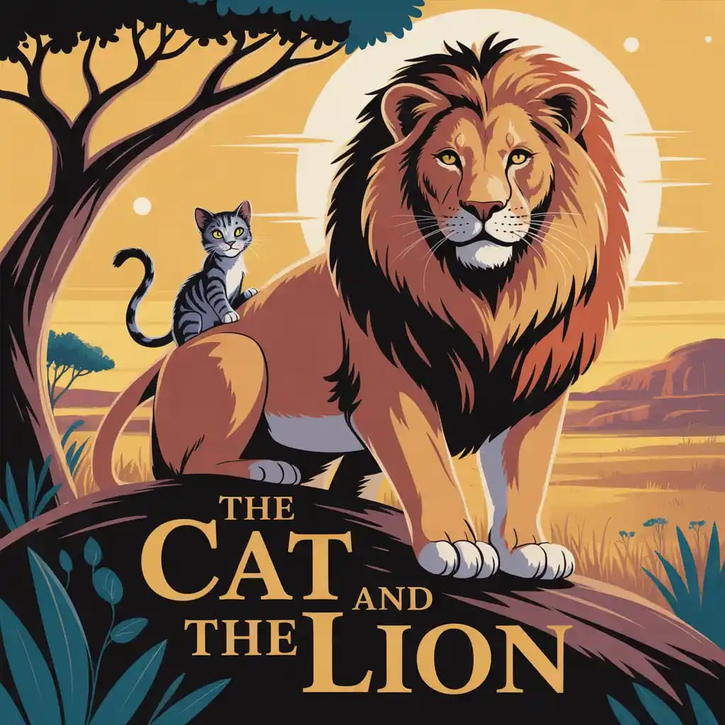 With the cat’s help, the lion avoided the hunters’ traps. The cat darted ahead, slipping unnoticed between the humans, knocking small stones and twigs to lure them away. When the time was right, the lion leapt from hiding with a roar so mighty it sent the hunters fleeing in terror, never to return.