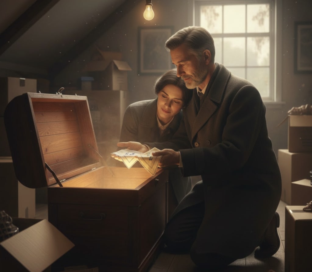 "Leo?" Sarah appeared in the attic doorway, wiping dust from her forehead. She looked at the two scraps of silk in his hand and softened. "Oh. You still have those."