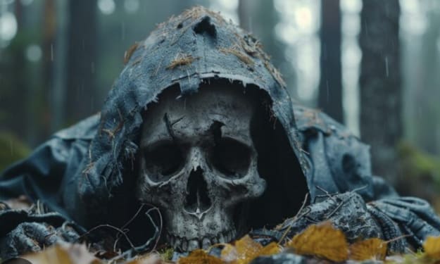 Out of the darkness, Death swoops down swiftly and encloses me in his shroud. Within seconds I am flying high above the treetops, the cold winter’s air blowing all around me. Then suddenly, without warning, in a quick fluid motion, a flap of his wings, Death releases me, and I fall through the black air gaining speed until finally I land with a crunch upon hundreds and hundreds of bones; remnants of victims long time past. It is lost amid this sea of femurs and skulls that I realize Death has brought me back to his lair to feed upon my flesh.