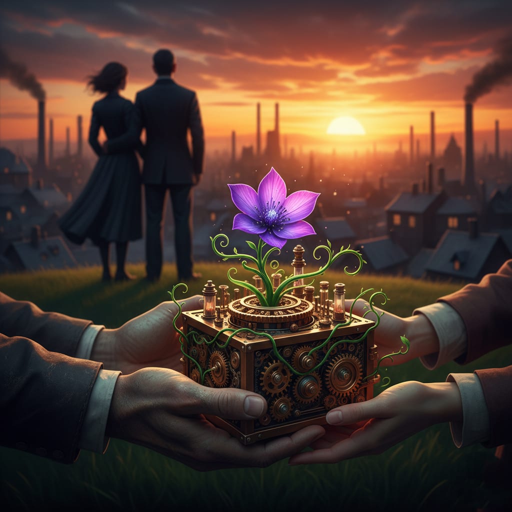 Elias watched, breathless, as a tiny green shoot erupted from the dark casing. It didn't grow like a normal plant; it moved with a frantic, beautiful energy, weaving itself around the brass pillars of the music box. Within minutes, a small, vibrant flower bloomed—a deep, bruised purple that defied the grey world outside.