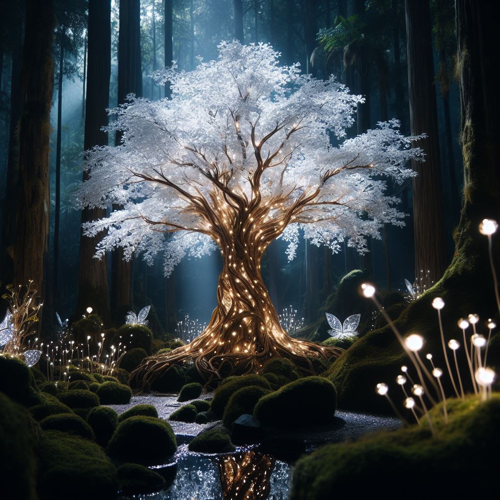 A response never transpired. The multitude of illuminated crystals on his branches and embedded in the rough bark of his trunk, slowly faded. Within minutes, all was dark. It remained this way for several, restless hours. He refused to or could not communicate during this enigmatic phase of stasis. Even their own cerebral prowess could not penetrate his mental blockade…they waited in silence.