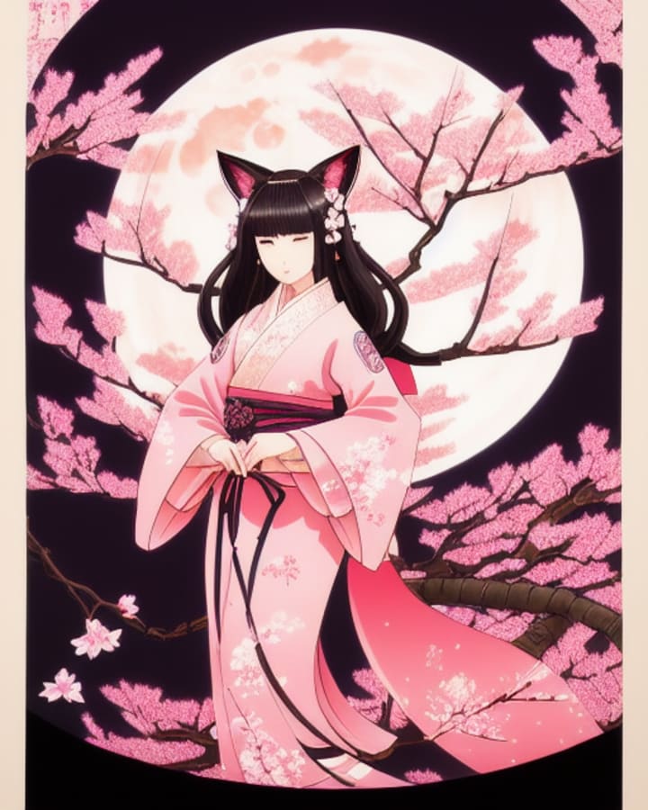 Kitsune watched as the full moon rose over the crystal clear pond surrounded by cherry blossom trees. A gentle breeze comforted her face. She touched her cheek as to remember who she was. To hold this image of herself in her mind.