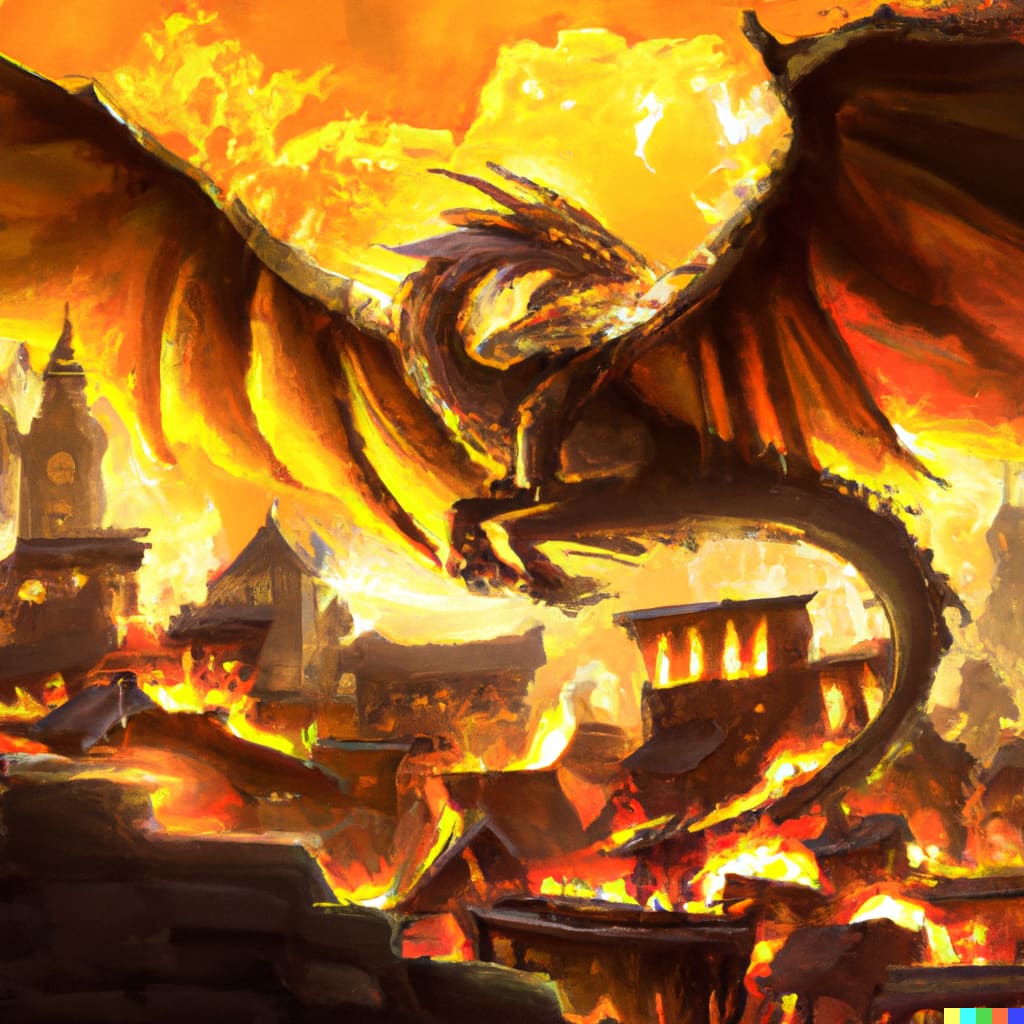 As we both stare out the window, shouts of help from people outside grow louder, and then we see it. Fire raining down from the sky lighting homes aflame, we see the creature causing this. A Wyvern, a dragon-like creature hovering in the sky above the village. On its back a rider shouting orders to men and women on the ground. These people were going house to house and dragging people out, only to cut them down in the street. I immediately grab my gear. “I’ll get the children '' Aubrey says as she takes her gear and rushes into their room.