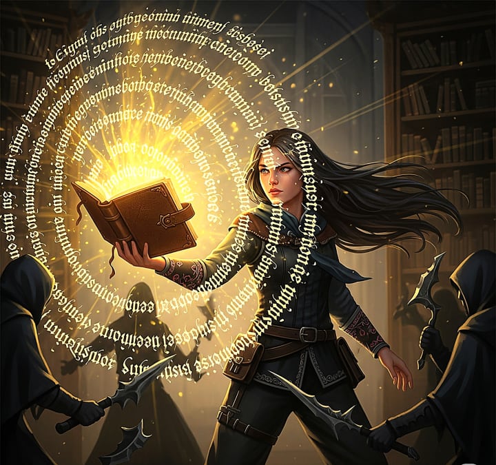 The pages flared with light, summoning barriers of words that drove back the intruders. Yet Echo urged her: “Your silence has been strength. Now, break it.”