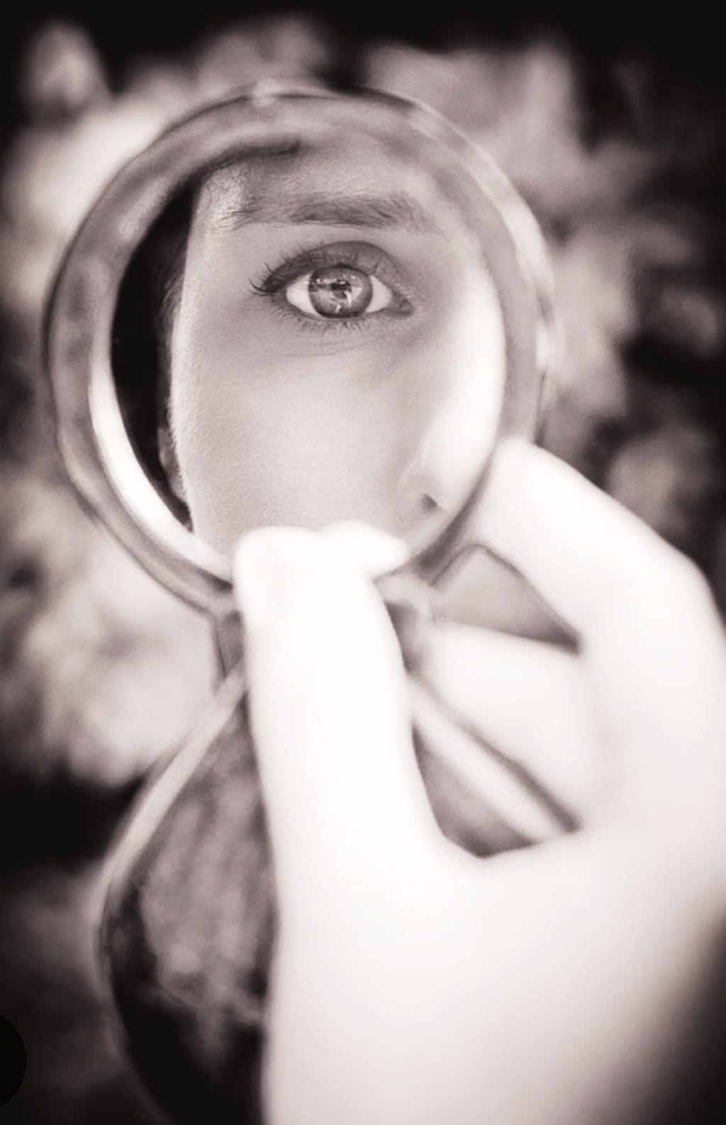 She looked into her rearview mirror. One eye saw forward beyond the mirror, the other saw the reflection from behind. Both allowed her to see events from past and present simultaneously. a 360 view of the environment, as well as the situation. All of a sudden in the mirror was another reflection. The reflection winked at her before exiting, leaving only her looking back at herself. It felt like her true self had been before her. She'd help herself and then others. She glanced at the mirror again, in the distance, in either direction was the mirror being, always there, expanding her view.