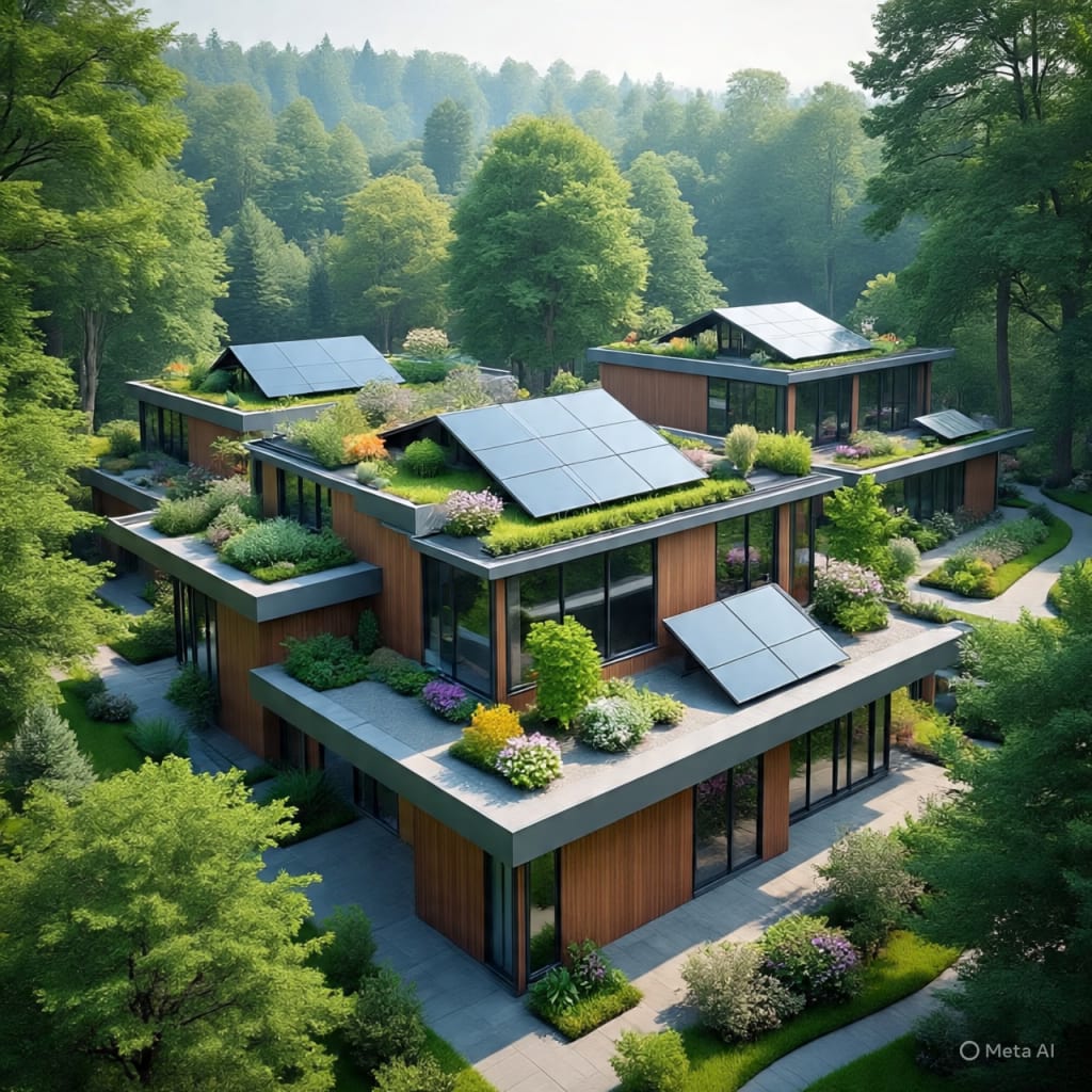In a nature city, buildings are designed not to block nature but to blend with it. Houses and offices have large windows that allow sunlight and fresh air to enter freely. Rooftop gardens and vertical forests cover tall buildings, giving them a soft, green look. Solar panels are installed to generate clean energy, and rainwater harvesting systems provide fresh water. Instead of destroying the environment, the architecture of such a city protects and preserves it.