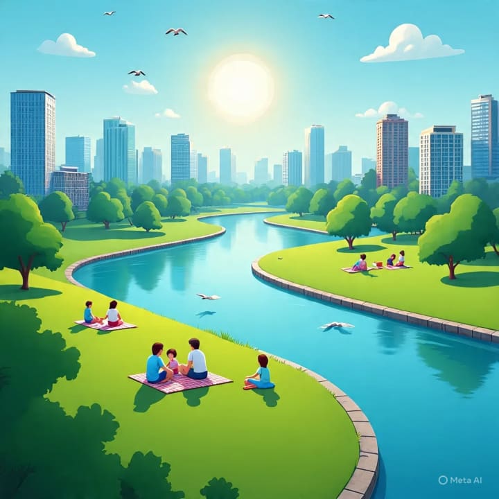 A nature city is incomplete without water. Flowing rivers, sparkling lakes, and small waterways running through the city add a sense of calmness and life. People walk along clean riverbanks, children play near lakes, and families gather for picnics beside water fountains. The presence of water also helps keep the climate cool and the soil fertile. Birds and animals thrive around these water sources, creating a perfect balance of biodiversity inside the city.