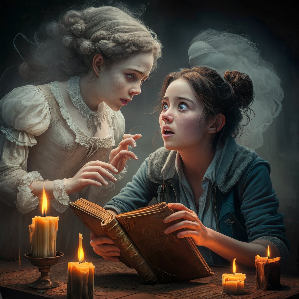 Suddenly, a spectral figure materialized before her, its translucent form shimmering in the dim light. Elara gasped in astonishment, her heart pounding in her chest. The apparition, a young woman with sorrowful eyes and a gentle demeanor, reached out to her, her touch as cold as the grave.