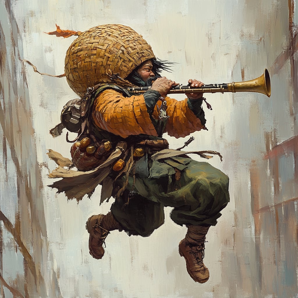 Jiro launched himself with force and precision, his movements sharp and deliberate. Komuso moved like mist, his Flying Feet barely whispering against the stone, his breath in harmony with the wind itself.