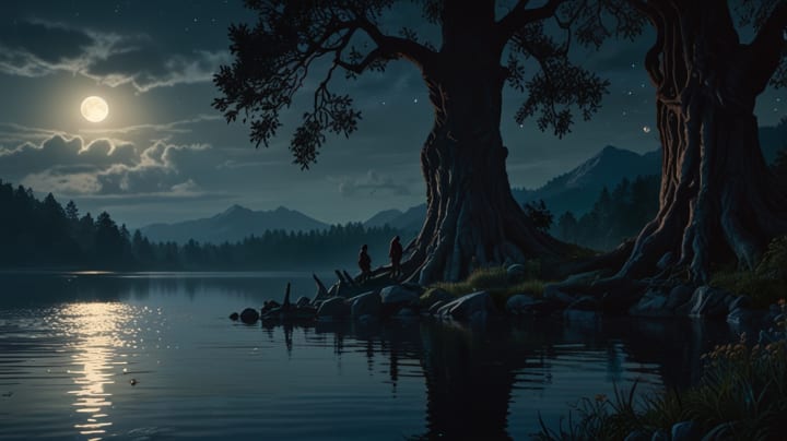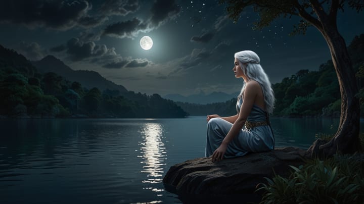 At the heart of the lake stood a solitary island, where an ancient oak tree grew. This tree was no ordinary tree; its roots dug deep into the earth, entwined with the very essence of the moon. Its leaves were silver, and they glowed softly, reflecting the light of the celestial body above. On this island lived Selene, the Guardian of the Moon. She was a being of immense beauty and power, with hair like spun silver and eyes that mirrored the light of the full moon. Selene had watched over the lake for centuries, ensuring that its magic remained undisturbed.