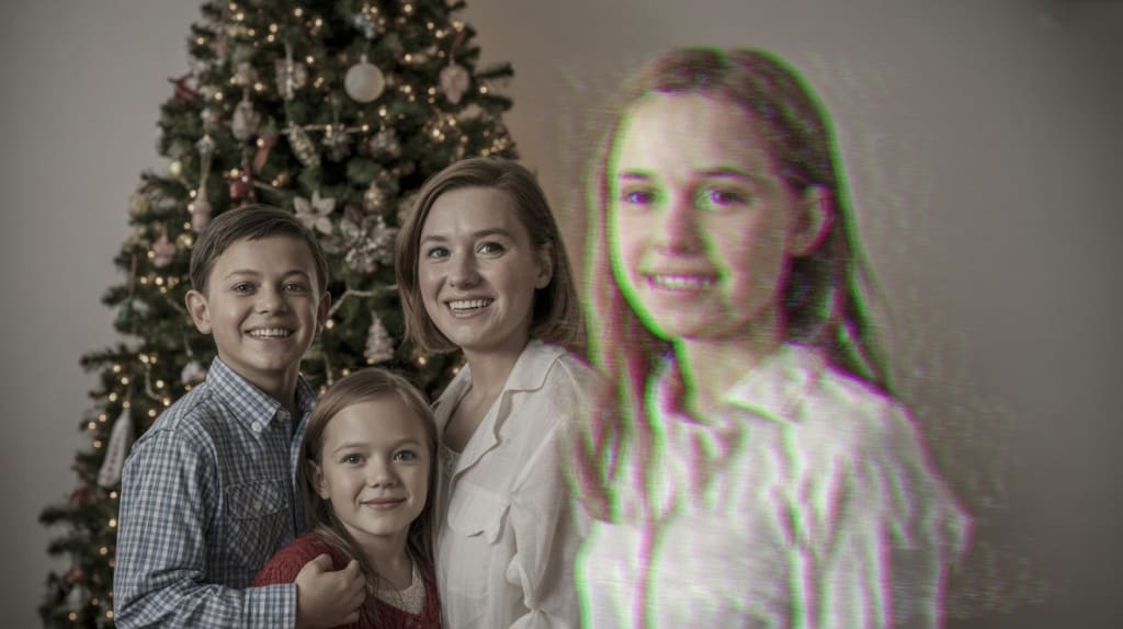 That night, she dug through the family photo albums. Christmas, 2022—gone. She remembered wearing a red sweater and standing beside the tree. But in the photo, only the tree remained. Her brother held up a gift where she should’ve been, smiling at someone invisible. Her father’s arm was wrapped around empty space.