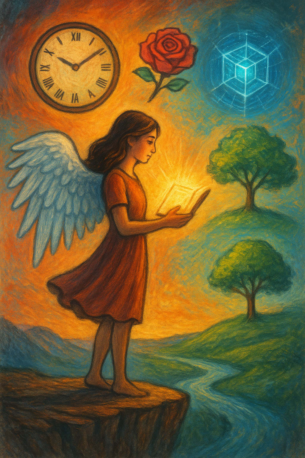In a world that often rushes forward without pausing, where moments slip through our hands like sand in an hourglass, there stood a girl on the edge of a cliff, holding a glowing book. Her wings, delicate and luminous, stretched behind her, brushing against the winds of change. Around her floated symbols of life itself — a clock, a rose, a tree by the river, and a geometric light that hinted at the future of technology. Each one was more than just an image. They were chapters of a greater story, a story the world needed to hear.