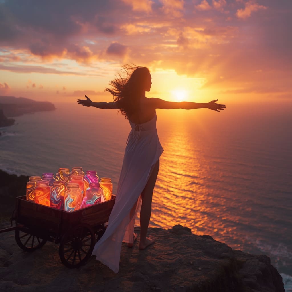 Every evening, just before the sun kissed the horizon, she stood on the cliffside market overlooking the ocean, her wooden cart glimmering with glass jars of every size. Inside each one, it seemed, swirled an impossible light—orange, pink, violet, and gold, moving like liquid silk. The jars hummed softly, like the faint sigh of the evening breeze.