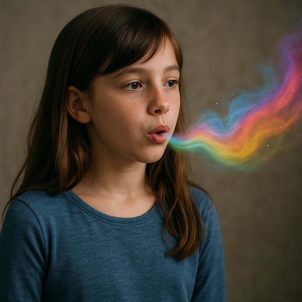 Elara didn’t speak like other children. Her words came out in colors—soft, glowing wisps of light that drifted from her mouth and painted the air. When she said “hello,” a warm yellow shimmered like sunlight. When she was sad, her words dripped in cool blue trails, like rain falling in slow motion. And when she laughed? The air exploded with swirls of pink, gold, and green—like a festival of joy.
