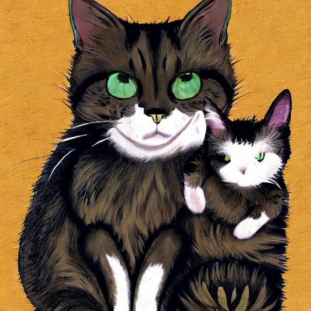 It was a sunny morning in the small town of Mapleville, and Lucy the cat was basking in the warmth of the sun on her favorite spot on the porch. She was a beautiful calico cat with fluffy fur and piercing green eyes. She was a proud mother of a tiny kitten named Timmy, who she had raised with all her love and care.
