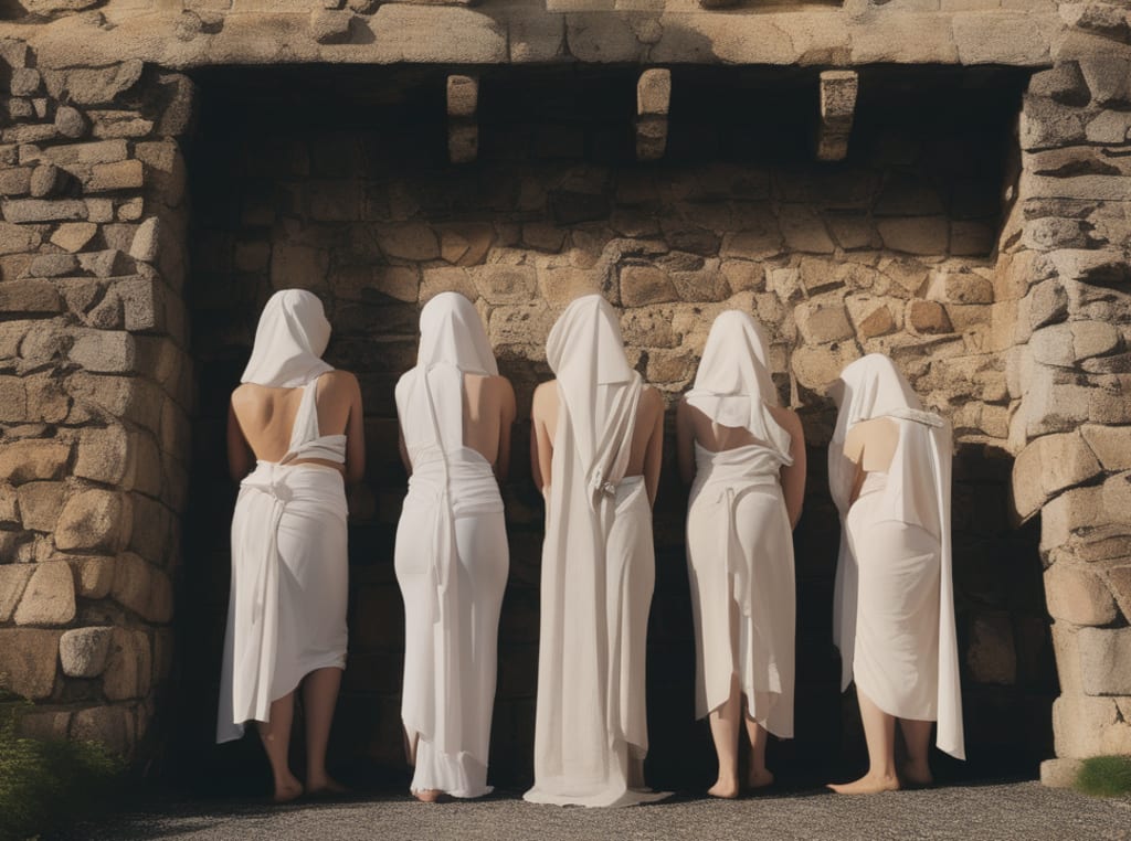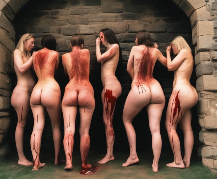 She stood naked with them against the city wall. It was high, dark, and made of rough, damp stones stacked together, cold. The wall chilled her bones when her naked body was pressed against it. She looked along the wall and was able to see joyous anticipation, hysterical passion, in the other unclothed women. Menacing shadows loomed large on the wall, daguerreotypes of heads painted by hand-held torches.