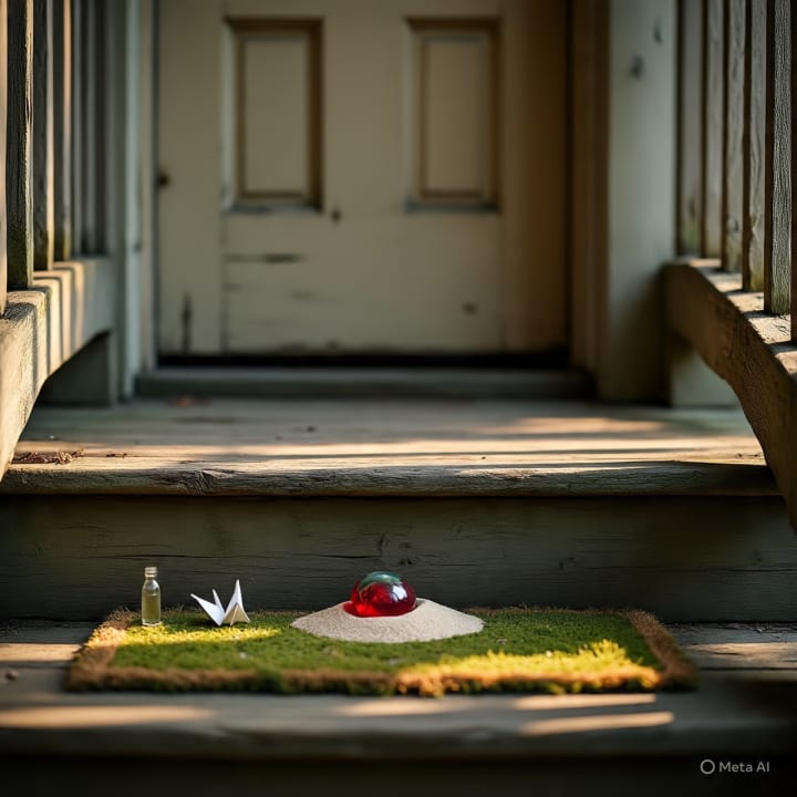 Instead, I left things behind. Little things. A folded paper crane made from my math homework. A small red marble I’d carried in my pocket since kindergarten. A tiny bottle filled with sand from my aunt’s beach house. I’d place them carefully on the front steps, just under the mossy welcome mat that hadn’t welcomed anyone in a decade.